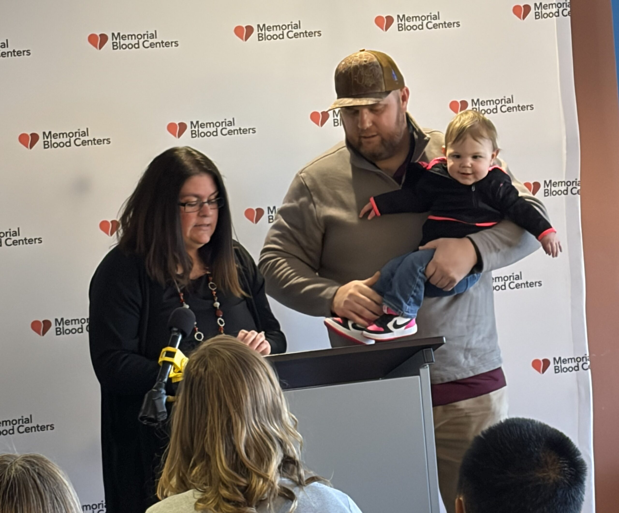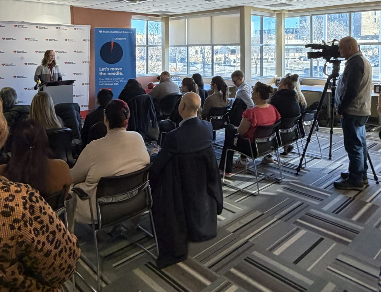 During the press conference, speakers emphasized the lifesaving importance of blood donation, shared firsthand perspectives from healthcare providers and patients, and urged Minnesotans to make blood donation a priority in the new year. Speakers and attendees included St. Paul Mayor Kaohly Her; Dr. Claudia S. Cohn, Professor of Laboratory Medicine and Pathology at the University of Minnesota; Kayla Fahey-Ahrndt, Transfusion Medicine Program Manager at M Health Fairview; Stephanie and Jesse Wenker, parents of a pediatric blood recipient, Sarah; and Kathy Geist, Vice President of Blood Operations at Memorial Blood Centers.