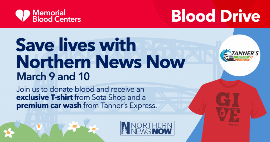 It’s here! Give blood with Northern News Now and support hospital patients across the Northland. As our thanks for stopping by, donors will receive a limited-edition MN Gives T-shirt designed by the Sota Shop and a Tanner’s Superior Shine car wash courtesy of Tanners Express.